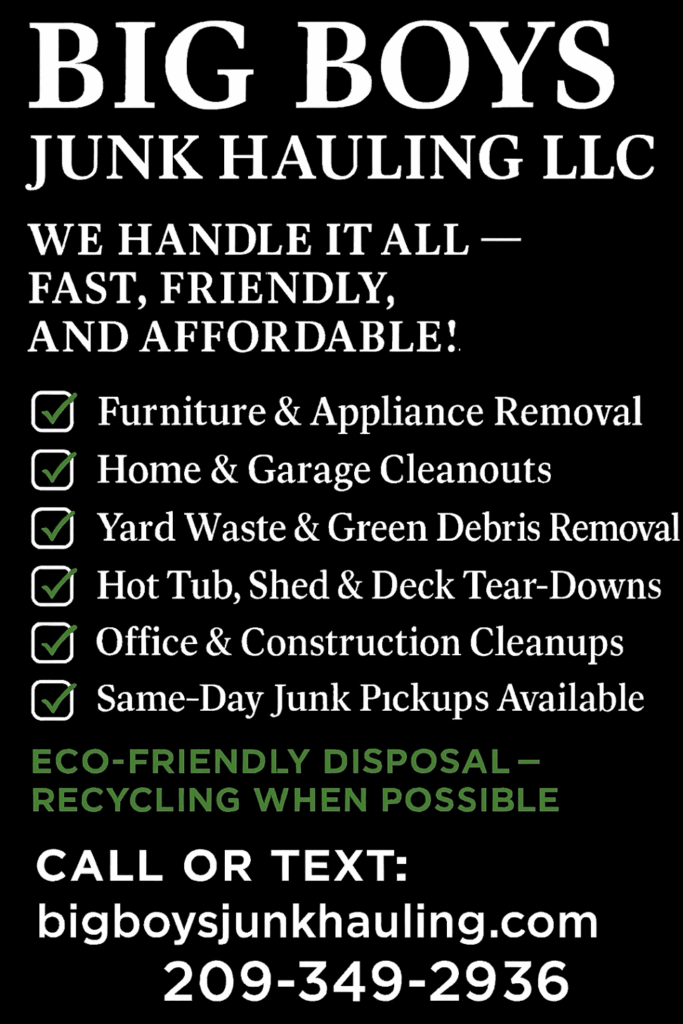 Big Boys Junk Hauling LLC is a locally owned and owner-operated junk removal company proudly serving San Joaquin County and all surrounding areas. What started as a dream to support a wonderful wife and daughter has grown into a reliable, community-focused service built on hard work, honesty, and a commitment to getting the job done right. No job is too big or too small — if you junk it, the Big Boys can haul it.